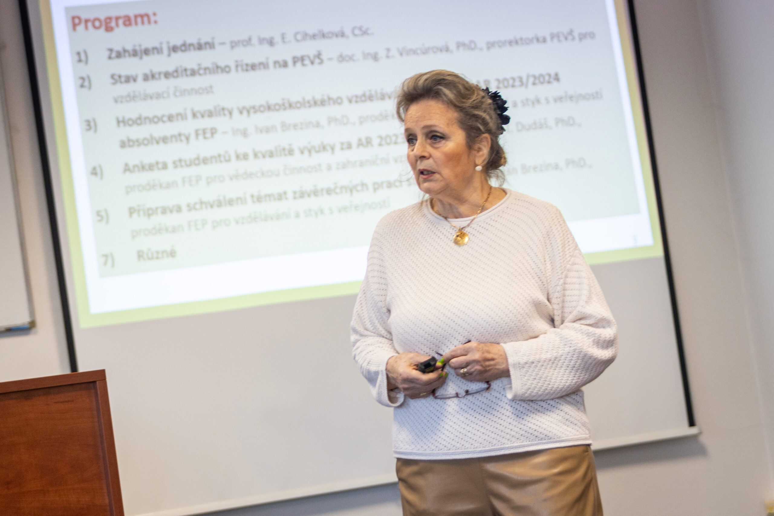 Druhé zasadnutie Rady pre strategický rozvoj študijných programov viedla predsedníčka(osoba zodpovedná za uskutočňovanie, rozvoj a zabezpečenie kvality IŠP a DŠP FEP PEVŠ a osoba zabezpečujúca profilové predmety v študijných programoch) prof. Ing. Eva Cihelková, CSc.