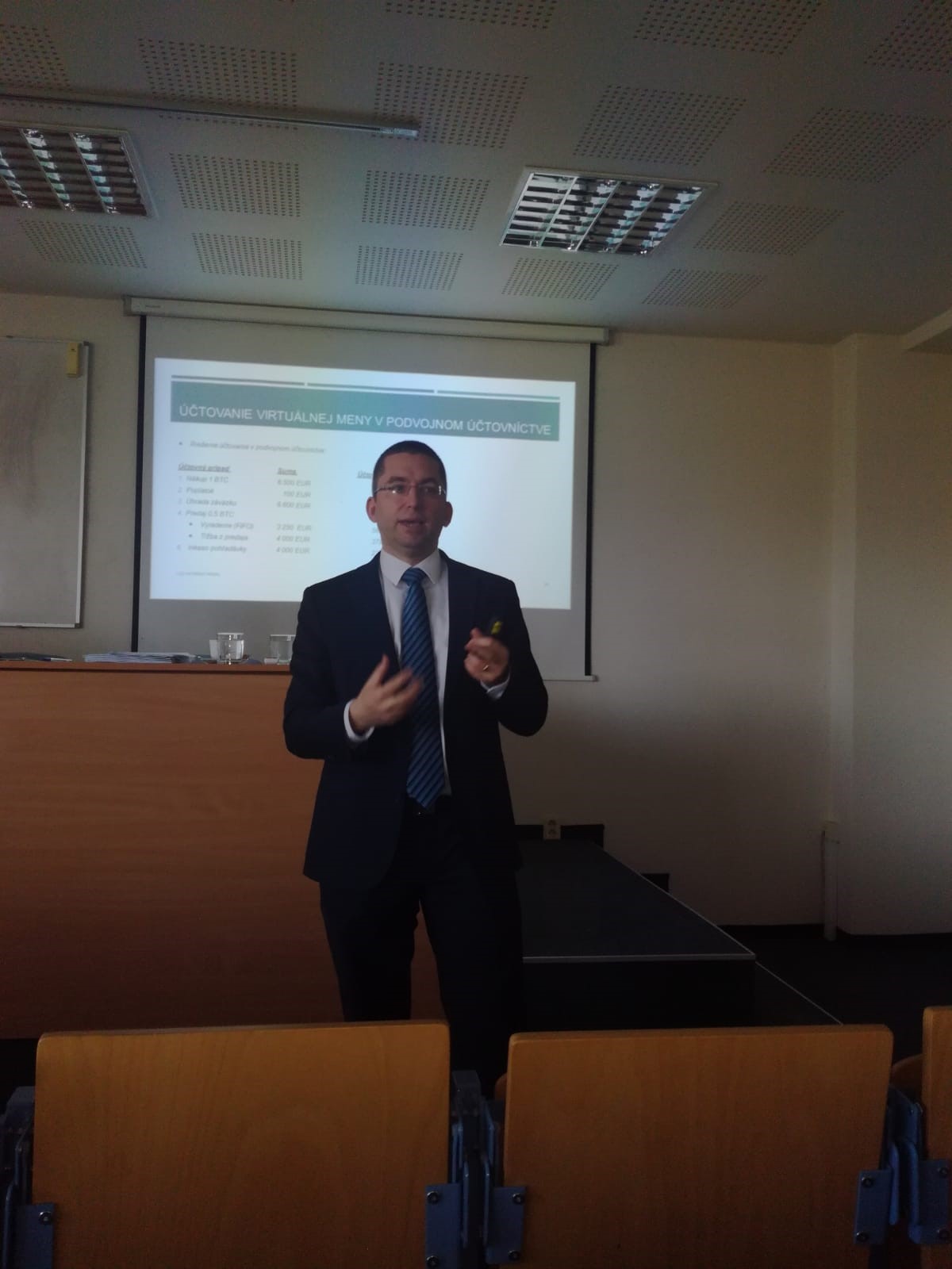 V rámci predmetu Hospodárska politika kapitoly rozpočtová a menová politika, ktorý vyučuje Ing. Stanislava Veselovská,PhD. sa dňa 16. 4. 2019 konala na FEP PEVŠ hosťovaná prednáška. Prednášku s názvom „Zdaňovanie digitálnych platforiem a virtuálnych mien na území SR“ odprezentoval Mag. Branislav Kováč, partner VDG SLOVAKIA, s.r.o.
