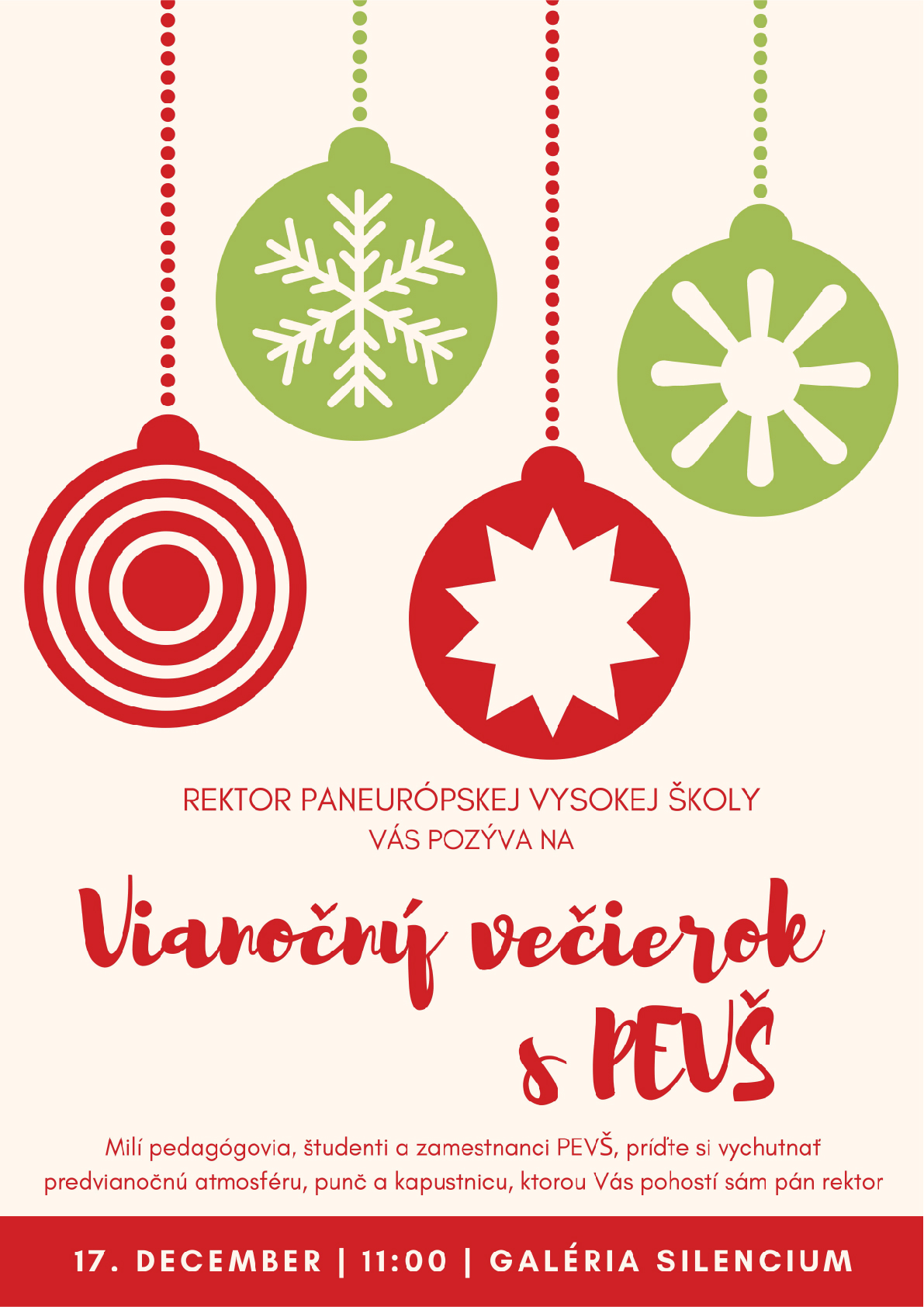 Pán rektor Paneurópskej vysokej školy srdečne pozýva všetkých pedagógov, študentov a zamestnancov na Vianočný večierok, ktorý sa bude konať dňa 17. decembra 2019 o 11:00 v Galérii Silencium na Tomášikovej 20.