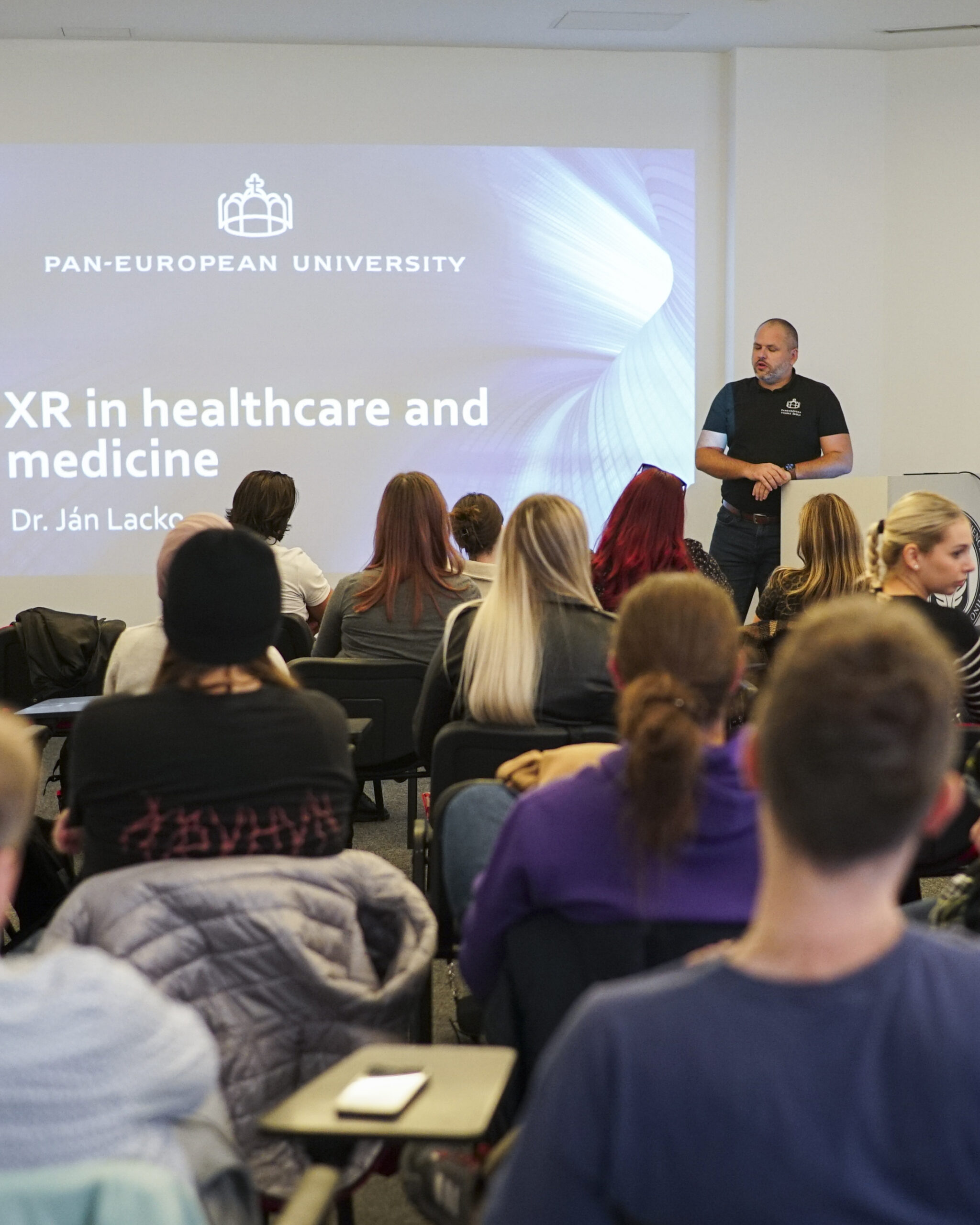 RNDr. Ján Lacko, PhD., prednášal na tému „Virtual Reality in Healthcare“, ktorá bola otvorená nielen pre študentov informatiky, ale aj medicíny.