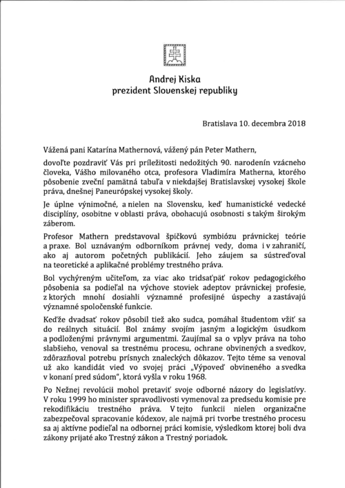 Slávnostná tabuľa je cennou poctou, nedokáže ale nahradiť cenné vedomosti a skúsenosti profesora Matherna. Paneurópska vysoká škola a všetci jej predstavitelia si nesmierne vážia prácu, ktorú profesor vykonal. Stal sa vzorom pre mnohých, bol doslova hybnou silou fakulty a celej univerzity.