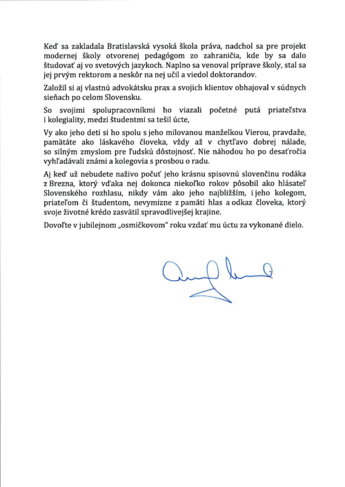 Slávnostného odhalenia sa zúčastnila aj doc. JUDr. Lucia Žitňanská, PhD. a prof. JUDr. Jozef Záhora, PhD. Boli jeho študentmi a on bol ich milovaný pedagóg, ktorému vďačia nielen za vedomostný, ale aj osobnostný rozvoj. K slávnosti prispel svojim listom aj prezident Slovenskej republiky, Andrej Kiska: