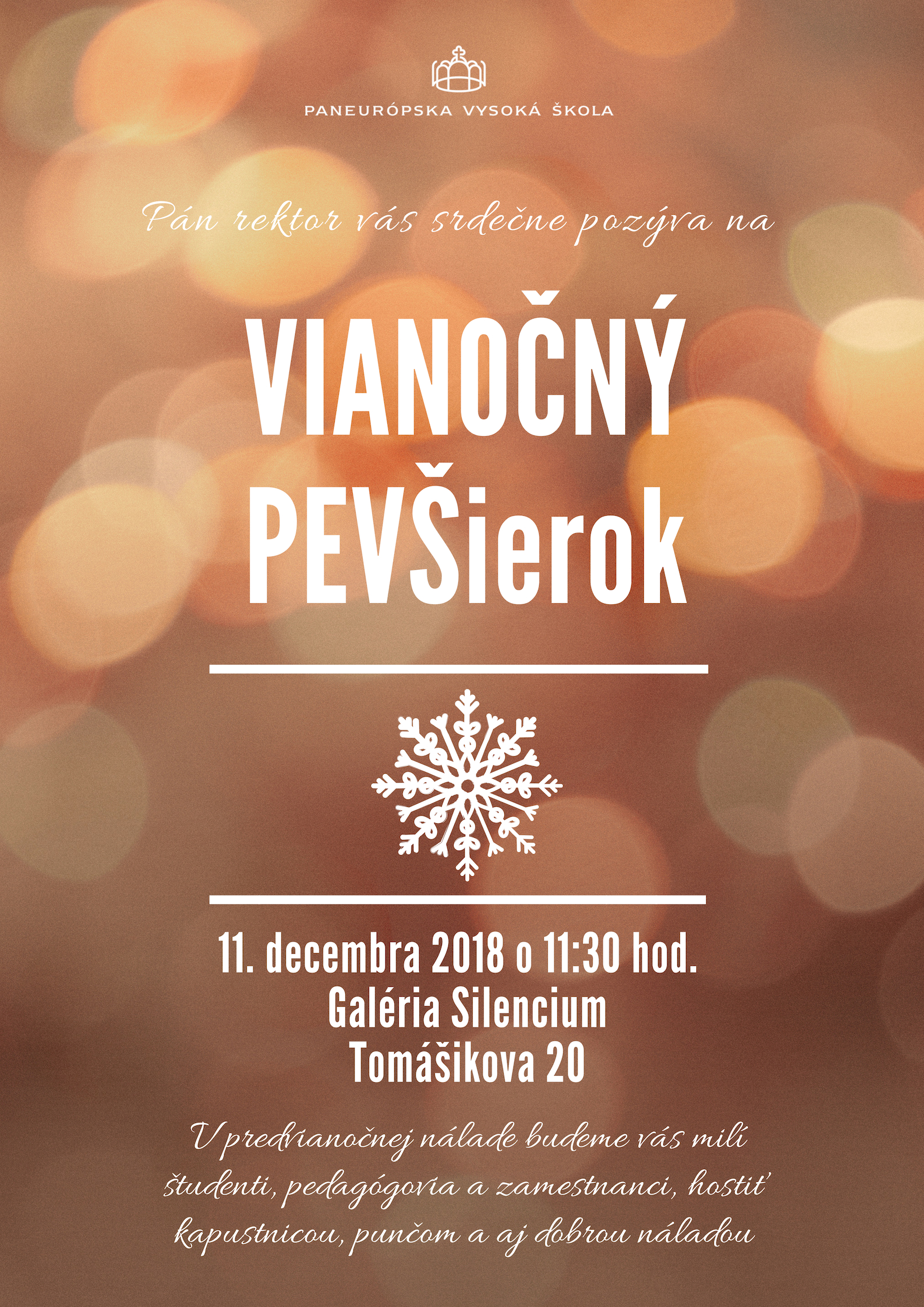 Rektor Paneurópskej vysokej školy srdečne pozýva všetkých pedagógov, študentov a zamestnancov na vianočný večierok, kde spoločne v predvianočnom duchu ukončíme zimný semster. Tradičná kapustnica s punčom bude rozvoniavať v priestoroch školy na Tomášikovej 20 už 11. decembra o 11:30 hod v Galérii Silencium. Chýbať nebude dobrá nálada, vianočný stromček a tombola so špeciálnymi darčekmi.