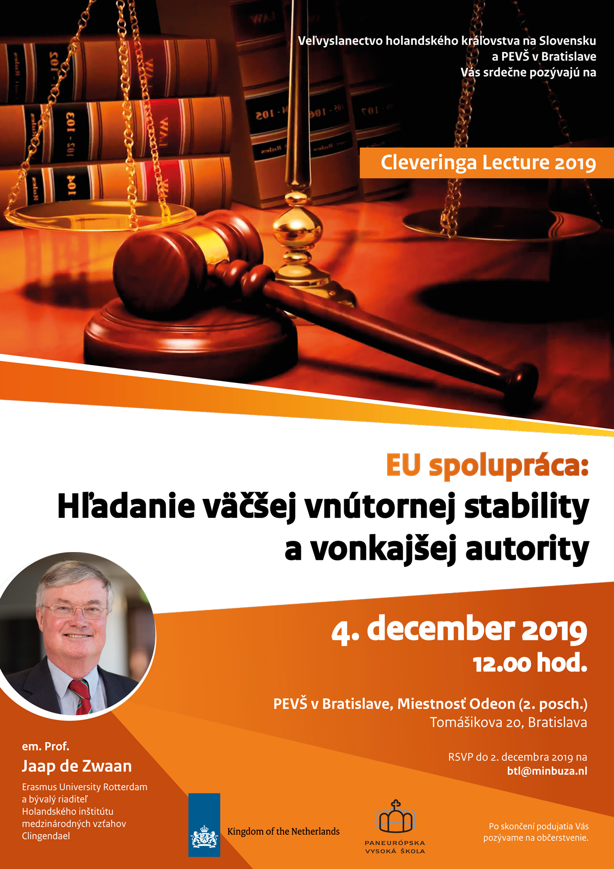 Fakulta práva PEVŠ v spolupráci s Holandským veľvyslanectvom v Bratislave pozývajú širokú odbornú verejnosť na výnimočnú prednášku prof. Dr. Jaap W. de Zwaana na tému Hľadanie väčšej vnútornej stability a vonkajšej autority, ktorá sa bude konať 4.12.2019 v aule Odeon na Tomášikovej 20. Ak Vás zaujímajú otázky právneho štátu, hodnôt EÚ a zamýšľate sa nad funkčnosťou súčasnej podoby Európskej únie, nenechajte si ujsť túto skvelú príležitosť a môžete sa zapojiť aj do diskusie. Po prednáške Vás pozývame na občerstvenie.