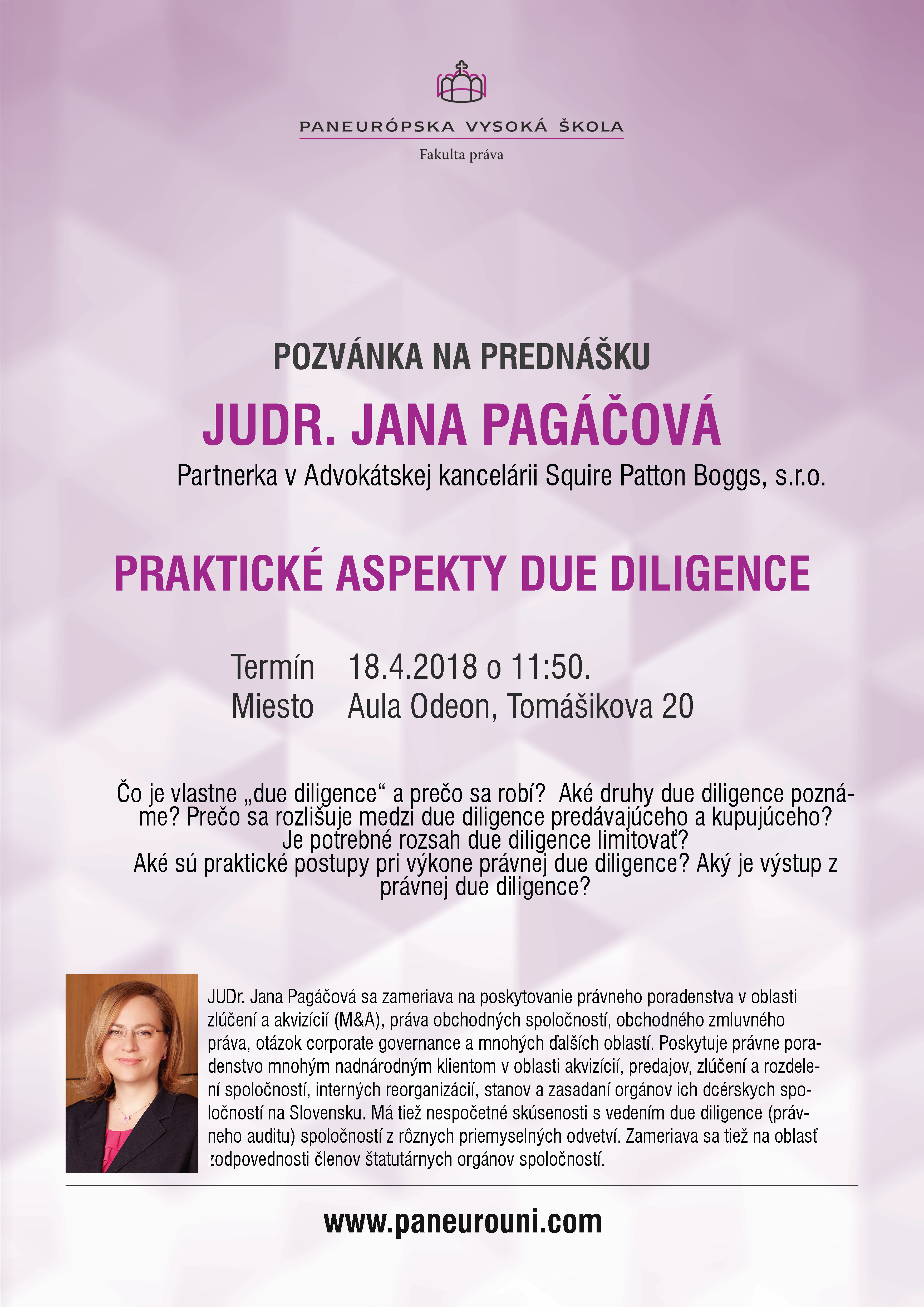 Srdečne vás pozývame na prednášku o praktických aspektoch due diligence s JUDr. Pagáčovou