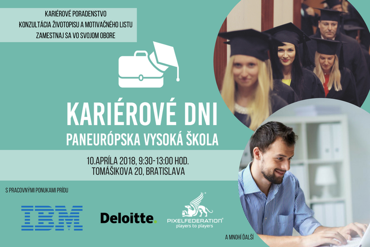 Dňa 10.apríla od 9:30 do 13:00 v priestoroch Paneurópskej vysokej školy na Tomášikovej ulici 20 v Bratislave prídu zástupcovia z TOP firiem, ktorých úlohou bude oboznámiť študentov všetkých fakúlt o možnostiach uplatnenia sa v reálnom zamestnaní. Študentov tak podporujeme v aplikovaní teoretických vedomostí získaných na akademickej pôde priamo v praxi, preto účasť na Kariérových dňoch môže byť smerodajná v ich úspešnom štarte v budúcom zamestnaní. Kariérne poradenstvo otvorí dvere k ich potenciálu a vysnívanému povolaniu, vďaka ktorému spoznajú svoje kvality, záujmy, potreby vo vzťahu ku kariérnemu smerovaniu. Dobre spracovaný životopis či motivačný list môže zaručiť úspech u potenciálneho zamestnávateľa, preto študenti fakulty psychológie budú v rámci poradenstva na Kariérových dňoch plne k dispozícii. Spolupráca medzi organizáciami a našou školou v oblasti hľadania talentov spomedzi našich študentov pretrváva už dlhší čas cez platformu JobTime na stránke školy. Táto stránka obsahuje aktuálny zoznam ponúk na voľné pracovné pozície, praxe a stáže, s ktorými našu školu oslovujú priamo potenciálni zamestnávatelia.