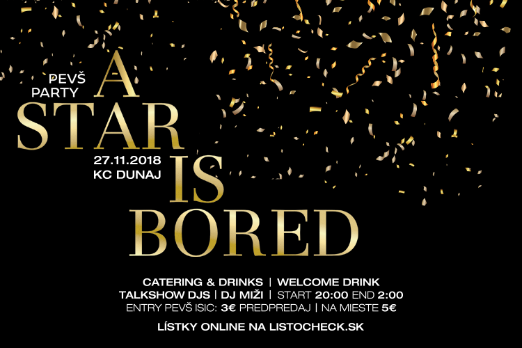 Ešte stále sa hovorí o legendárnej PEVŠ párty na Dunaji, ale čo tak vytvoriť si nové spomienky? Aby sme sa naladili na rovnakú vlnu aj tentokrát, pozývame vás na našu PEVŠácku párty do legendárneho KC Dunaj, ktorý bude patriť iba vám. Na famózny večer plný glittrov a svetielok 27.11. (utorok), s očarujúcim výhľadom na Bratislavu len tak nezabudneš! Tvoje chuťové poháriky potešíme gurmánskymi delikatesami či lahodným šampanským. O tanec a zábavu sa s Indie setmi postará kapela Talkshow Djs, ktorých niečo pred polnocou vystrieda mladá, ambiciózna a talentovaná DJka MIŽI. Pozvaní sú všetci študenti PEVŠ, denní a externí. Pedagógovia sú vítaní tiež! S organizačným tímom sme vymysleli ďalšie súťažné aktivity a nebude chýbať ani tombola.