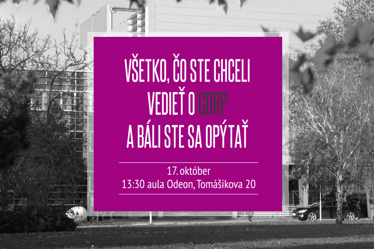 Fakulta práva Paneurópskej vysokej školy (PEVŠ) pripravila pre svojich študentov, ale i pre širokú verejnosť, prednáškový cyklus na aktuálnu tému GDPR. Prednáška sa uskutoční na pôde fakulty na Tomášikovej ulici v Bratislave 17.októbra.