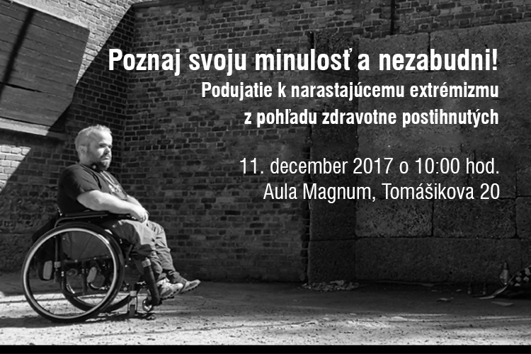 Mimoriadne aktuálna téma extrémizmu, ktorá odhaľuje málo spomínané tabu z obdobia II. svetovej vojny – ľudí s postihnutím a ich masívny odsun do koncentračných táborov. Ku Dňu ľudských práv iniciovala Fakulta práva PEVŠ spoločne s Fakultou masmédií a Fakultou psychológie PEVŠ prednášku na tému Poznaj svoju minulosť a nezabudni. Uskutoční sa dňa 11.12. o 10:00hod. v budove školy na Tomášikovej ulici v Bratislave, Aula Magnum.