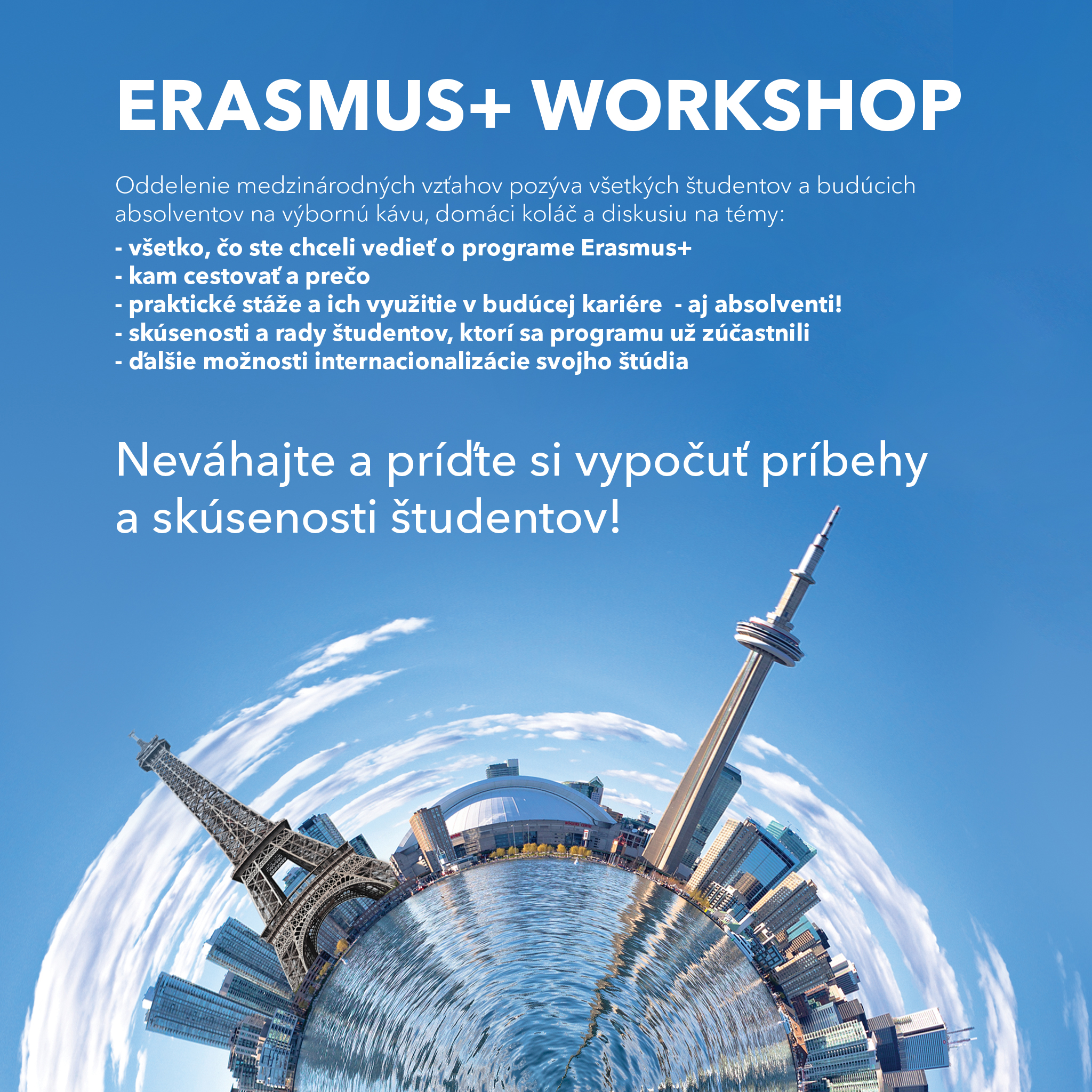 Pri príležitosti spustenia prihlasovania sa do programu Erasmus+ Vás Oddelenie medzinárodných vzťahov pozýva na informačný workshop, ktorý sa bude konať: