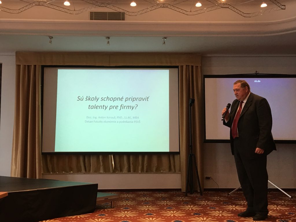 „K tomu, aby sa mladí ľudia vracali naspäť domov a nechodili tak húfne študovať do zahraničia je dôležité, aby mali zmysluplné životné výzvy a adekvátne podmienky pre zamestnanie na Slovensku,“ tvrdí doc. Ing. Antonín Korauš, PhD., LL.M., MBA, dekan Fakulty ekonómie a podnikania PEVŠ, ktorý vystúpil s témou „Sú školy schopné pripraviť talenty pre firmy?“ v úvode konferencie.